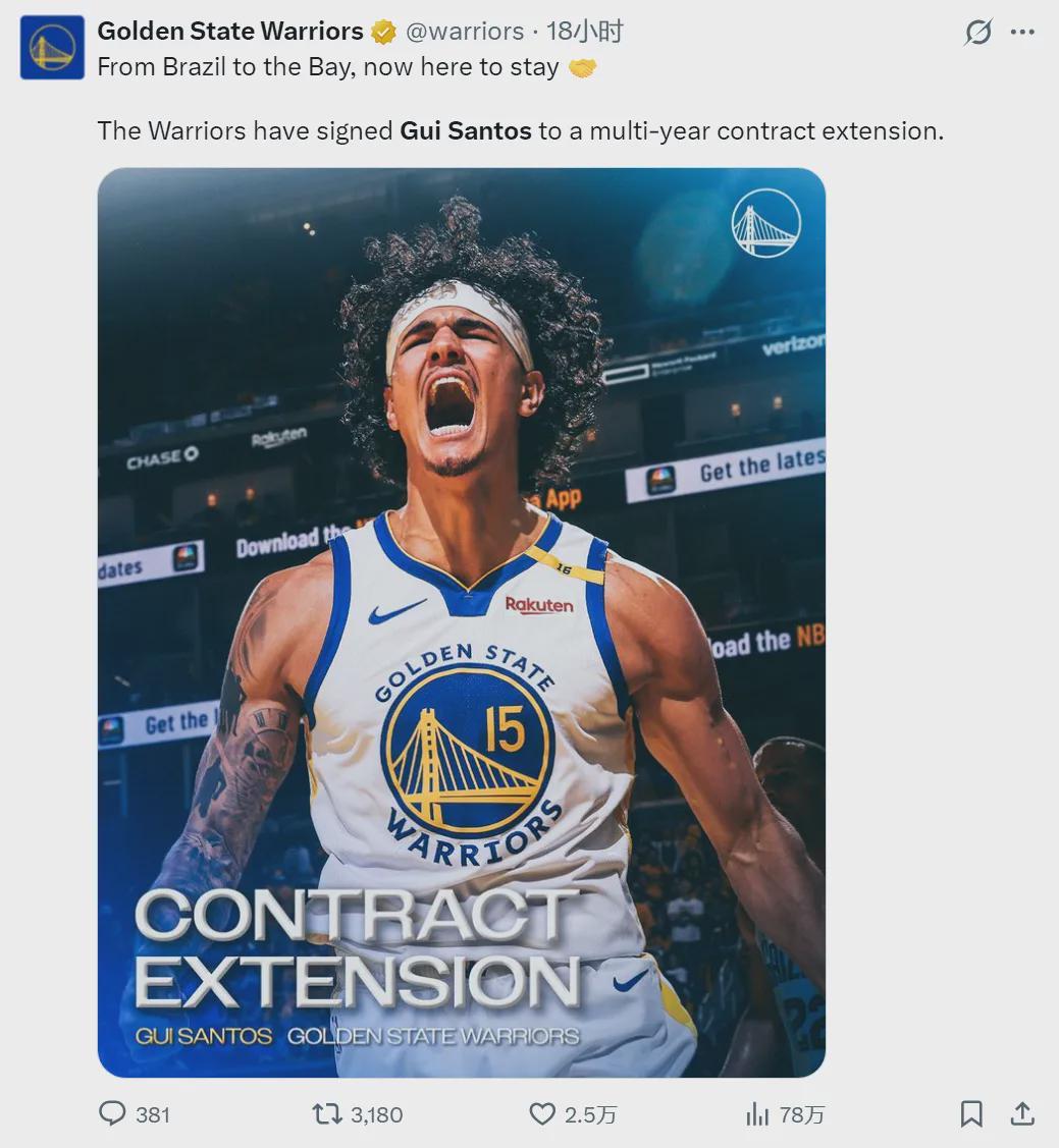 勇士官方宣布:正式跟吉-桑托斯(Gui Santos)完成续约,双方签下多年合同。另据NBA名记Shams报道,这份合同是3年1500万美元。桑托斯原有的合同3年514万美元,2023年签约,2026年夏天到期,本赛季薪水222万美元。