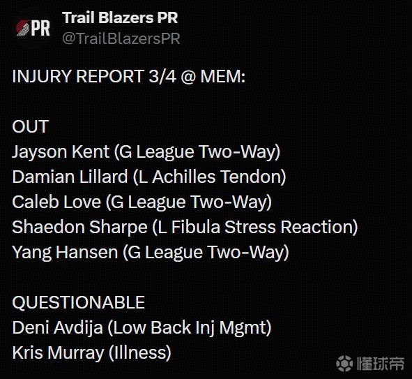 北京时间3月5日NBA常规赛,开拓者将对阵灰熊。赛前开拓者公布了本场比赛的伤病名单。