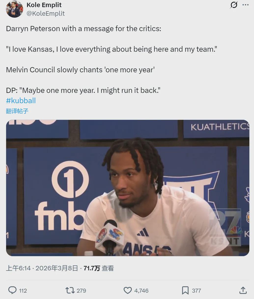 众所周知,2026年NBA选秀大会有三大状元热门:AJ-迪班萨、达林-彼得森和卡梅隆-布泽尔。万万没想到,前两个已经喊着要退选了。达林-彼得森说道:“我爱堪萨斯,我爱这里的一切,我爱我的球队,我可能会回来再打一年。”