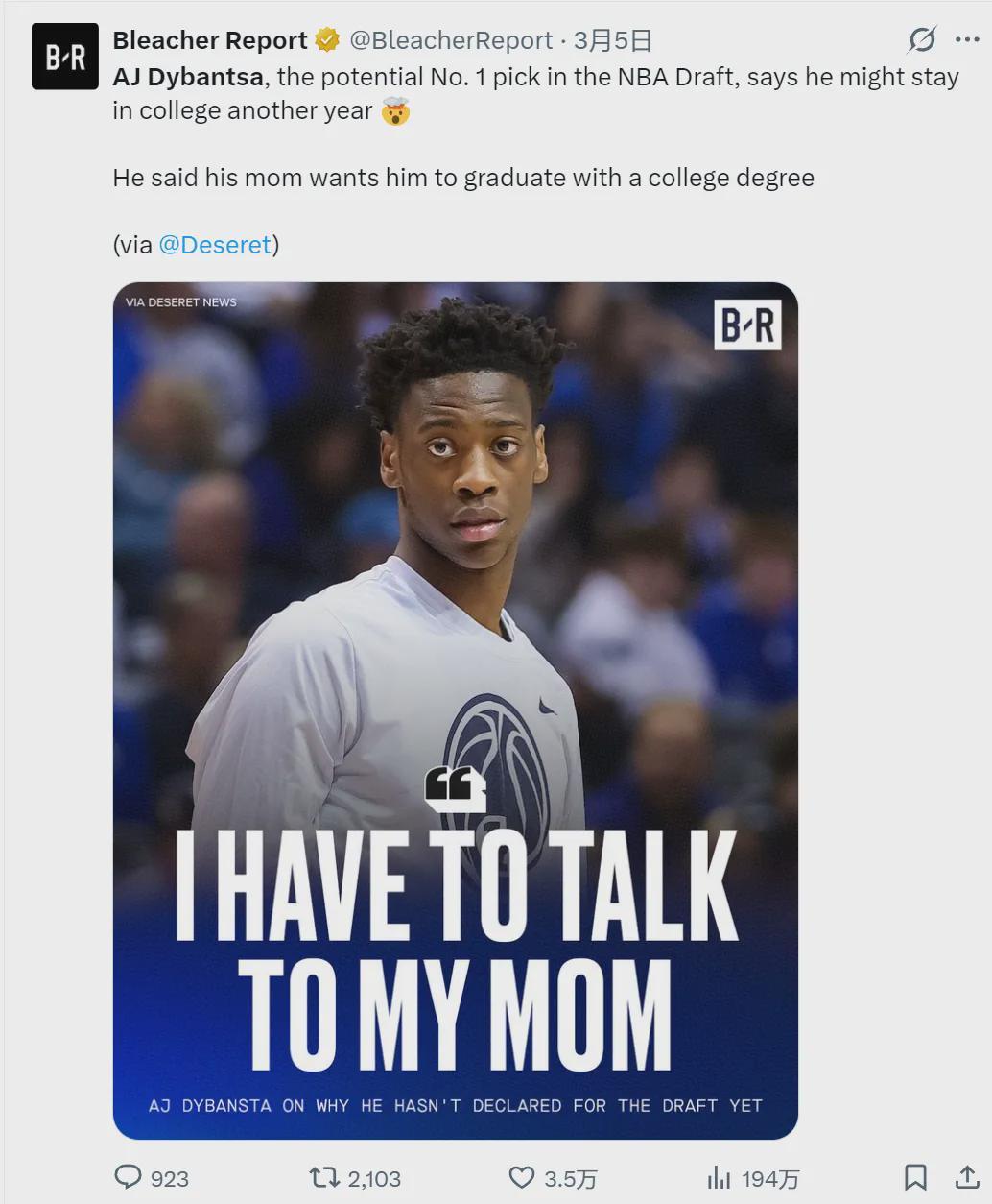 AJ-迪班萨说道:“今年我可能不会离开大学,因为我妈妈希望我能拿到学位。她想让我有个退路,我得先跟我妈聊一聊。”其实这些都是弗拉格玩剩下的:2025年2月,弗拉格表示想在杜克大学多打一年,2026年再参加NBA选秀。