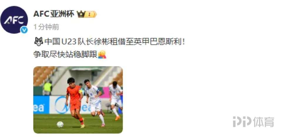 AFC亚洲杯官方微博消息,此前加盟狼队的中国U23队长徐彬将租借至英甲巴恩斯利。