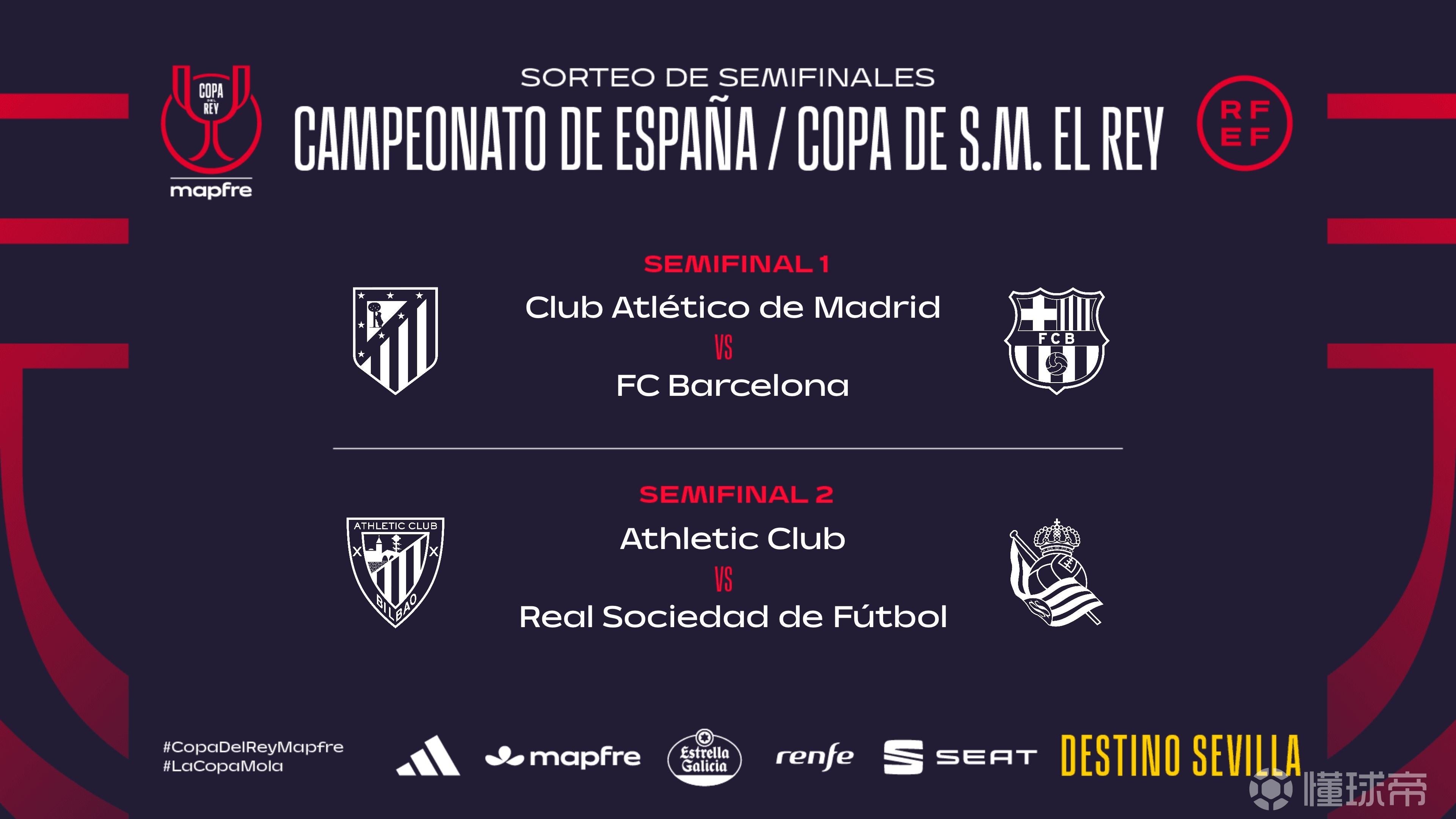 北京时间2月6日晚,西班牙国王杯半决赛抽签结果出炉,巴塞罗那遭遇马德里竞技,毕尔巴鄂竞技将对阵皇家社会。