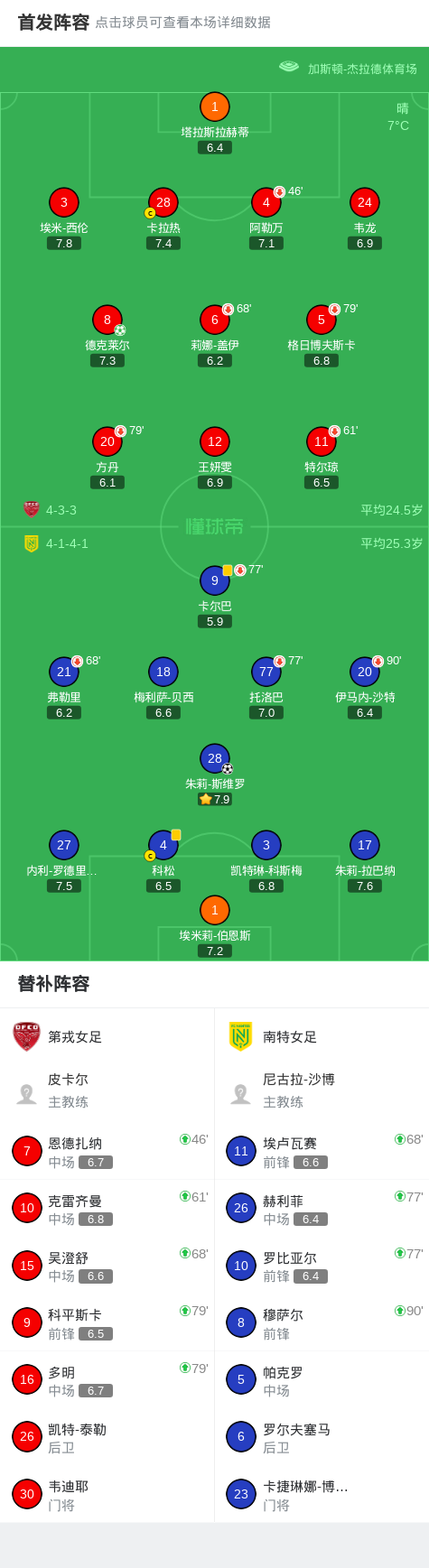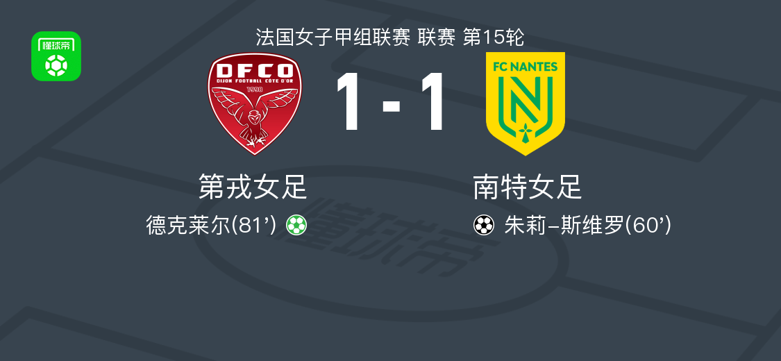 北京时间2月8日法国女子甲组联赛 联赛 第15轮,第戎女足主场对阵南特女足。第戎女足德克莱尔破门。南特女足朱莉-斯维罗破门。最终比分第戎女足 1-1 南特女足。
