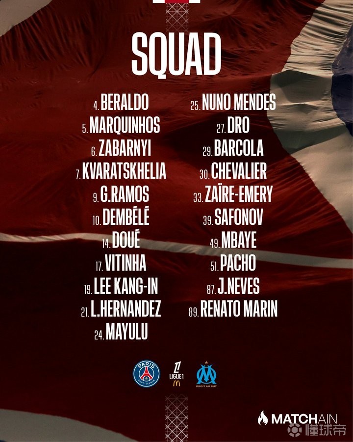 北京时间明天凌晨03:45,巴黎将迎来法甲第21轮主场对阵马赛的法国国家德比,赛前,巴黎官方公布了本场比赛的大名单,其中克瓦拉茨赫利亚回归,德罗-费尔南德斯在列,阿什拉夫停赛。