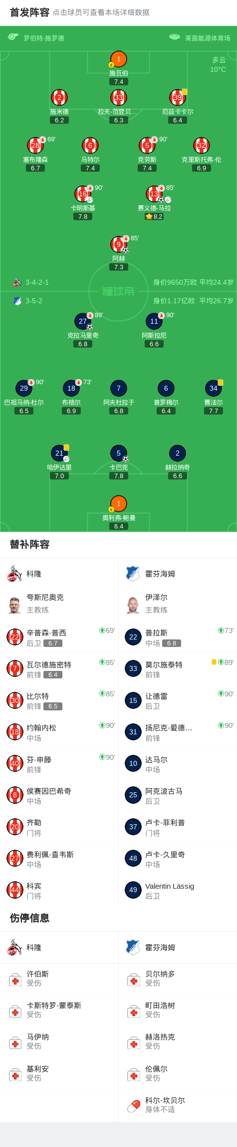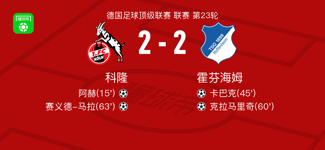 北京时间2月21日德国足球顶级联赛 联赛 第23轮,科隆主场对阵霍芬海姆。科隆阿赫破门,赛义德-马拉破门。霍芬海姆卡巴克破门,克拉马里奇破门。最终比分科隆 2-2 霍芬海姆。