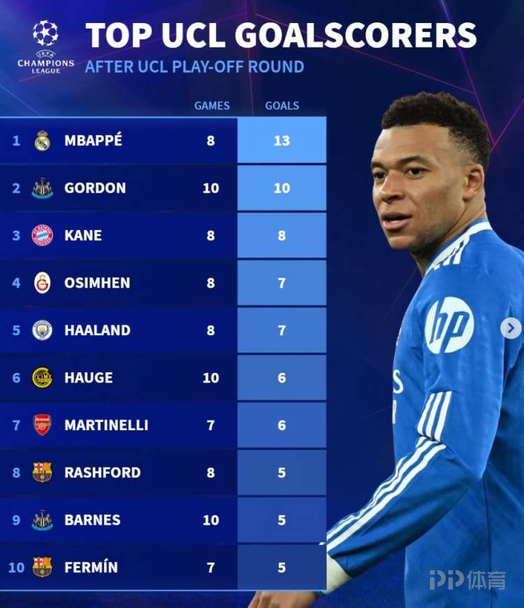 欧冠淘汰赛附加赛已经完赛,《转会市场》也统计了本赛季欧冠射手榜,姆巴佩居首。