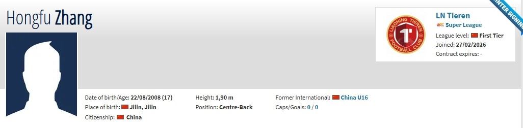 北京时间2月27日,德转更新,辽宁铁人约100万人民币签下恒大足校17岁后卫张洪福。