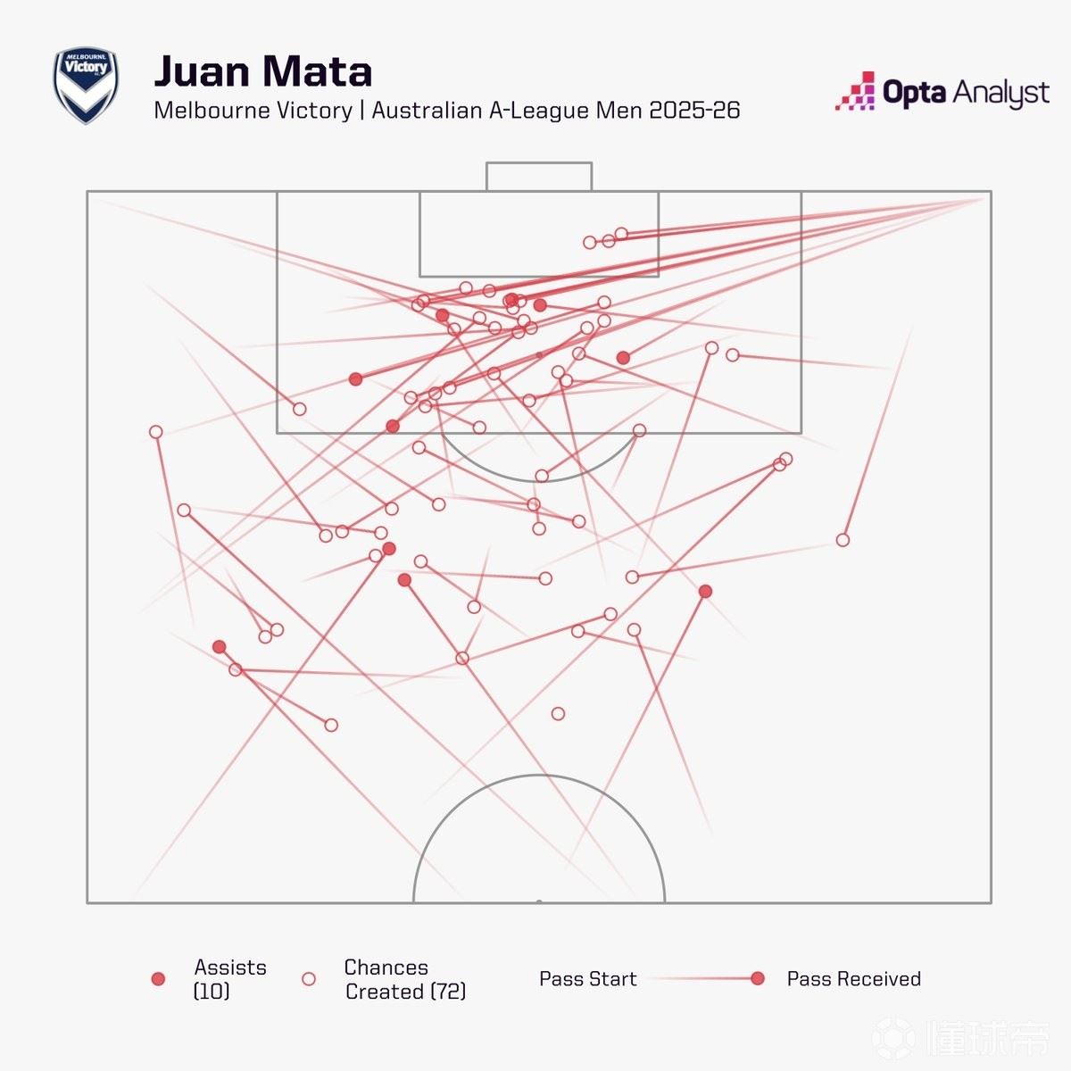 据统计,马塔本赛季至今在澳超联赛中创造机会次数最多,同时也是助攻最多的球员。