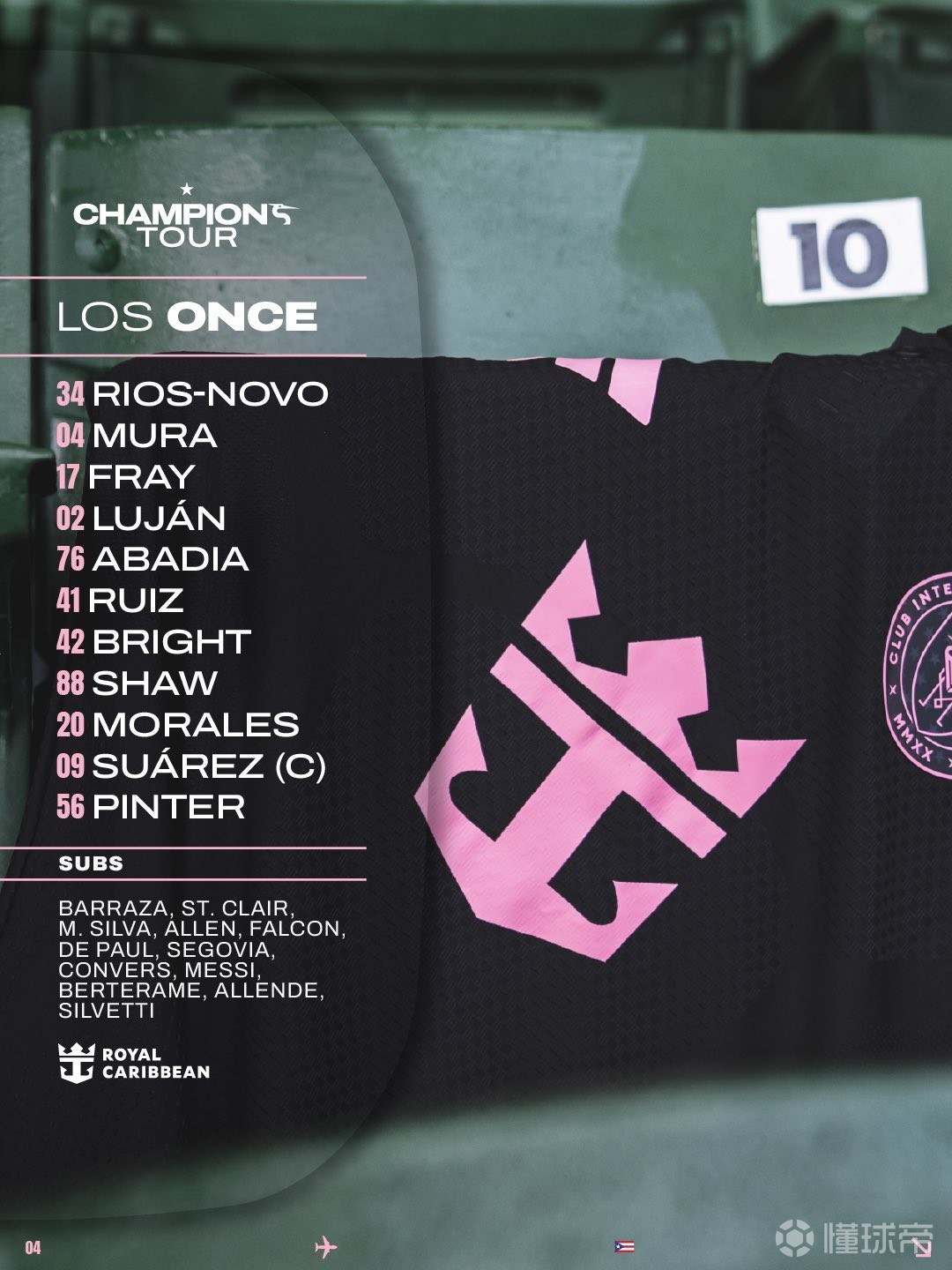 迈阿密国际首发:34-里奥斯、4-穆拉、14-弗雷、2-卢汉、76-阿巴迪亚、41-鲁伊斯、42-布赖特、88-肖、20-莫拉莱斯、9-苏亚雷斯、56-平泰尔