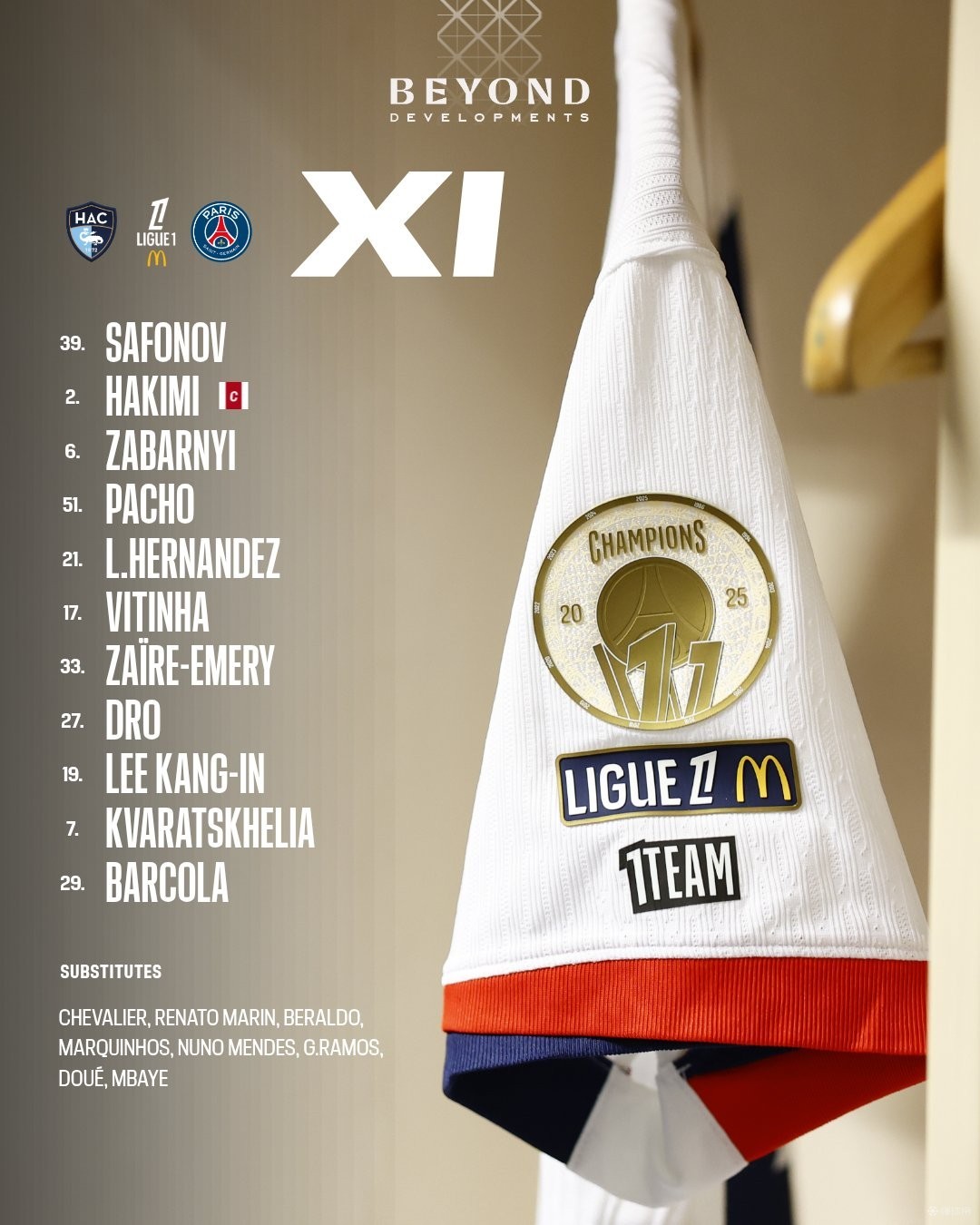 巴黎首发:39-萨福诺夫、2-阿什拉夫、6-扎巴尔尼、51-帕乔、21-卢卡斯-埃尔南德斯、33-扎伊尔-埃梅里、17-维蒂尼亚、27-德罗-费尔南德斯、19-李刚仁、29-巴尔科拉、7-克瓦拉茨赫利亚
