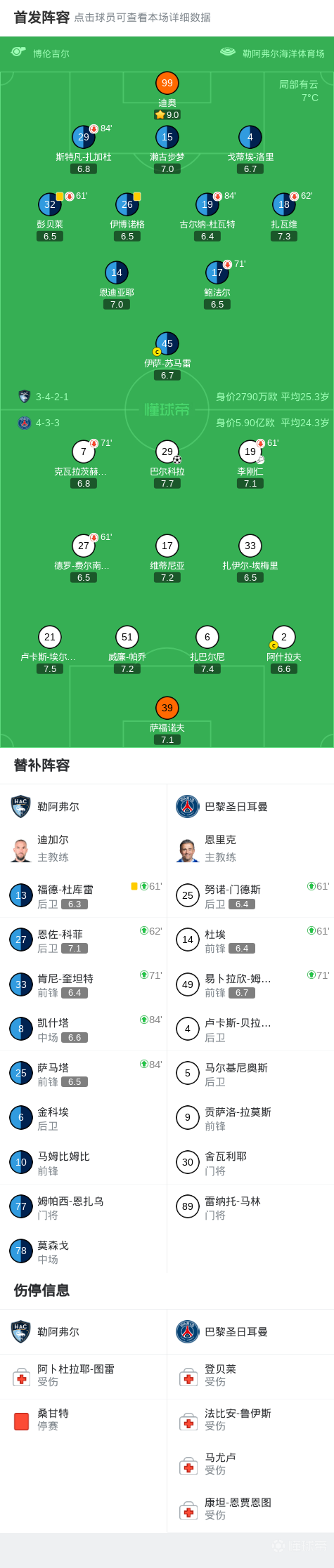 第37分钟,李刚仁传中,巴尔科拉头球破门,巴黎1-0勒阿弗尔