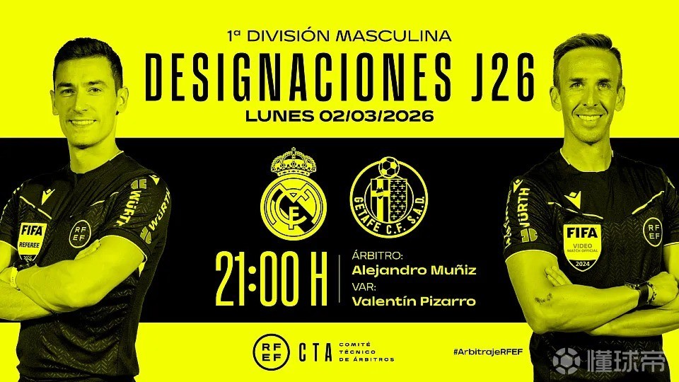 西班牙足协官方公布了周一西甲比赛裁判安排,亚历杭德罗-穆尼斯将执法皇马vs赫塔费。