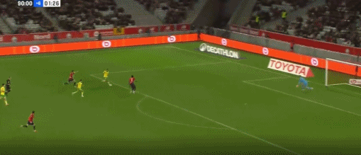 第90+4分钟,默尼耶将球回做,恩戈伊补时破门,里尔1-0南特
