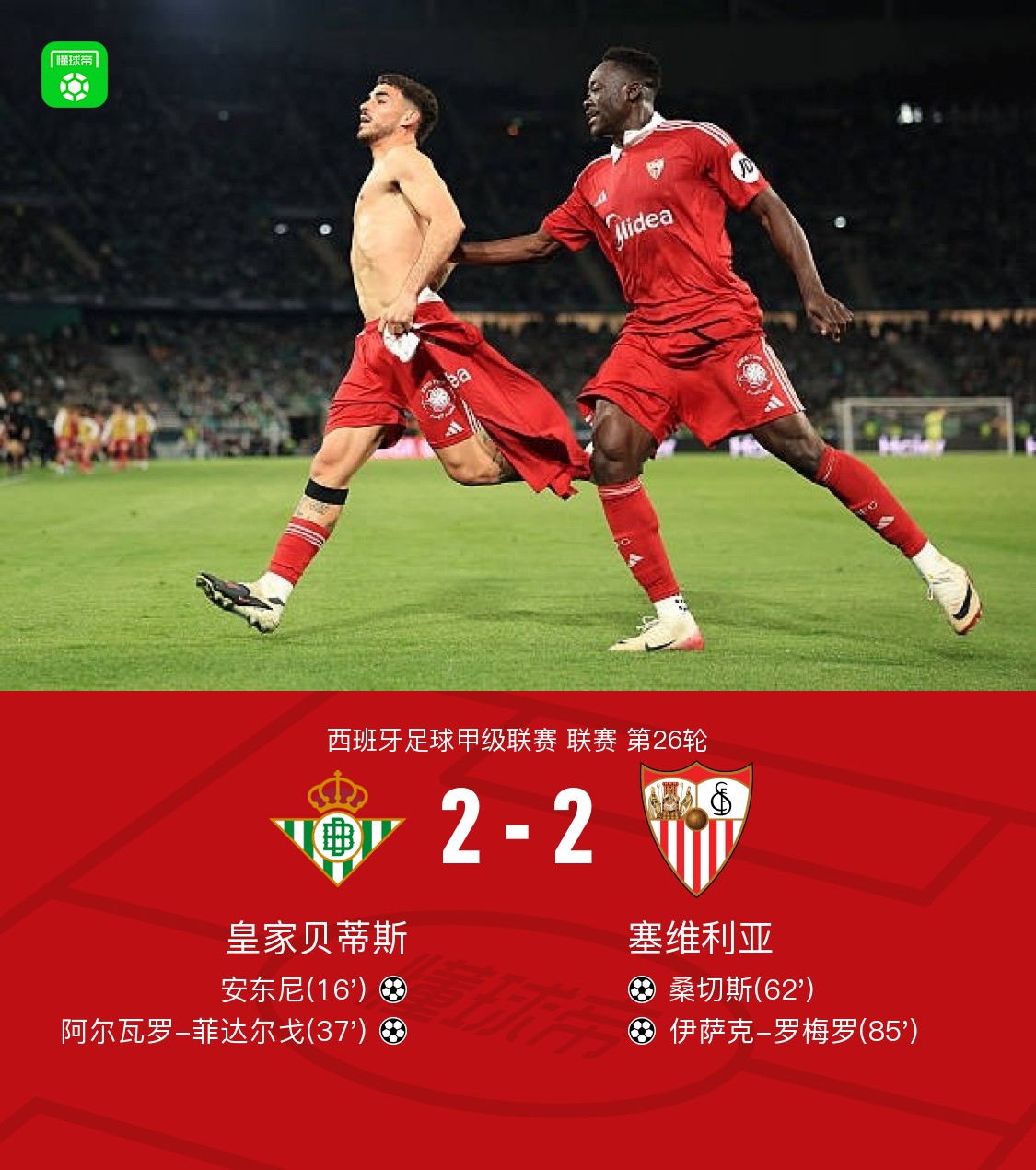 北京时间3月2日西班牙足球甲级联赛第26轮,皇家贝蒂斯主场对阵塞维利亚。上半场安东尼凭借一记精彩的倒钩破门为贝蒂斯取得领先,随后阿尔瓦罗-菲达尔戈破门扩大比分。下半场桑切斯破门扳回一球,伊萨克-罗梅罗破门将比分扳平。最终比分皇家贝蒂斯 2-2 塞维利亚。