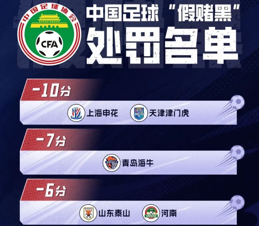 在这同时,包括中超联赛冠军上海海港队、联赛亚军上海申花队、足协杯冠军北京国安队、山东泰山队、天津津门虎等9支中超球队,都先后被中国足协罚款罚分。