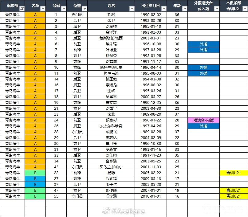 所以我们看青岛海牛,A名单没有一个U21球员。包括和邝兆镭同时注册在B名单的韦子贤这是去年在中甲已经打上主力的球员了,他不可能再去打U20。所以大概率是因为A名单没有空间了才把邝兆镭注册在B名单的。至于新赛季他能在中超出场多少,那就得在赛场上说话了。