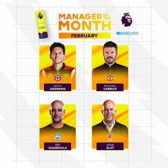 北京时间3月5日,英超官方公布了2月最佳主帅的候选名单,其中安德鲁斯、卡里克、瓜迪奥拉和斯洛特在列。
