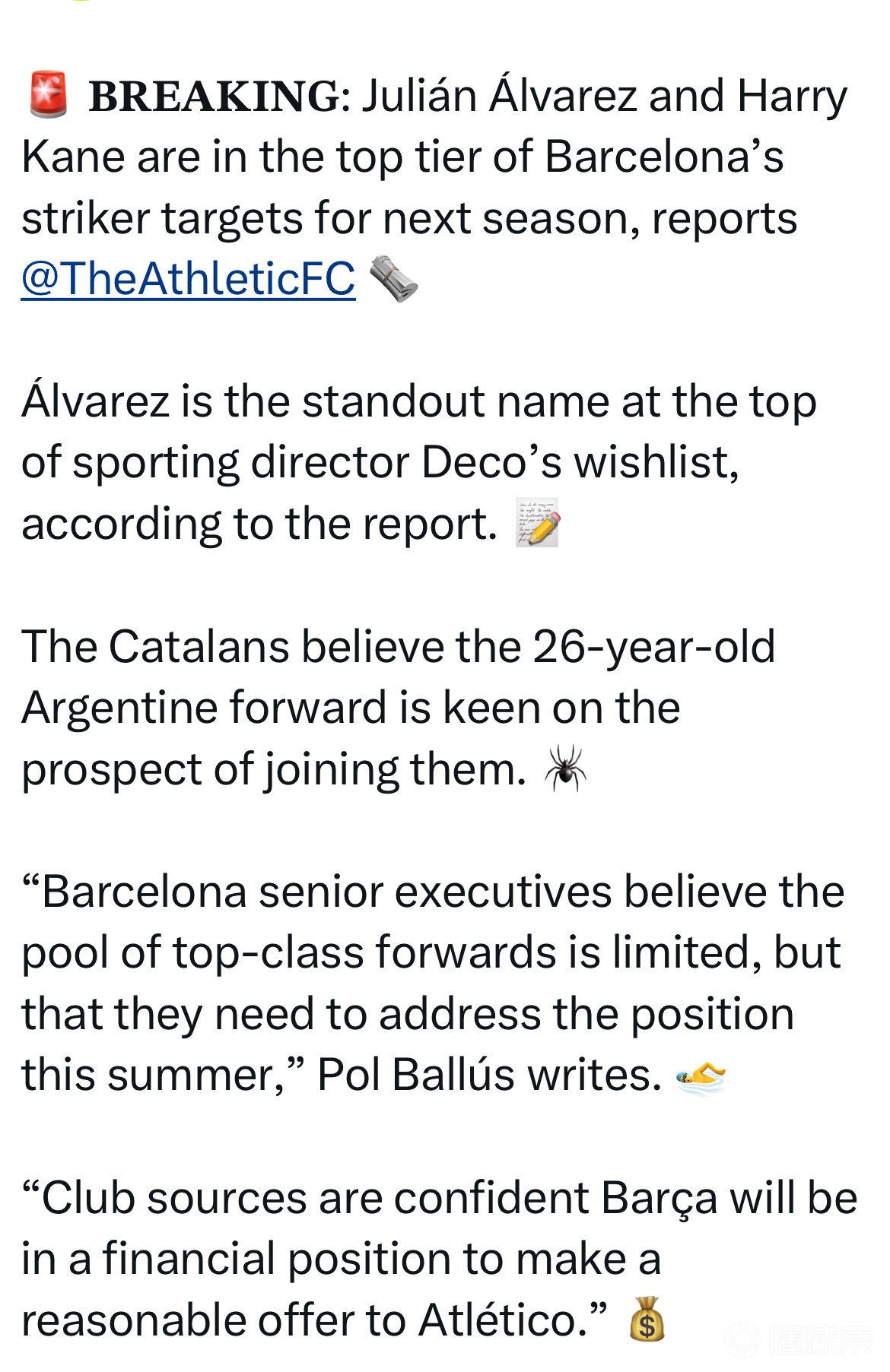 阿尔瓦雷斯与凯恩位列巴萨下赛季锋线引援第一梯队?据《The Athletic》报道,阿尔瓦雷斯和凯恩已成为巴塞罗那俱乐部下赛季前锋位置的头号目标。报道指出,在体育总监德科的引援愿望清单中,阿尔瓦雷斯是当之无愧的首选名字。加泰罗尼亚方面认为,这位 26 岁的阿根廷前锋对加盟巴萨的前景充满兴趣。记者波尔·巴卢斯(Pol Ballús)写道:“巴萨高层认为,目前市场上顶级前锋的资源非常有限,但俱乐部必须在这个夏天解决锋线问题。”“俱乐部内部消息人士confident地表示,巴萨在财务上将具备向马德里竞技提出合理报价的能力。”