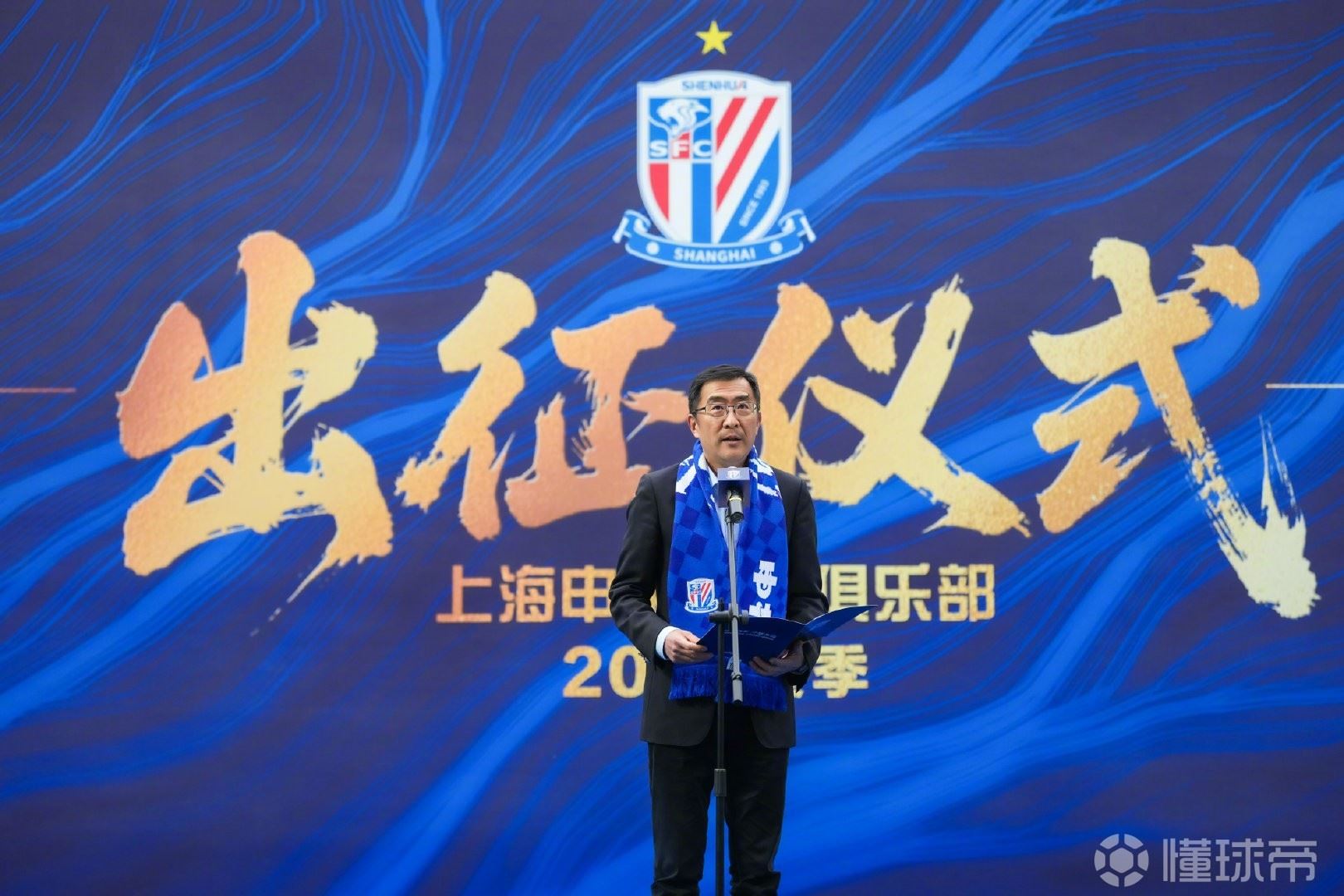 出征仪式上,俱乐部董事长谷际庆作动员讲话。他首先向长期以来一直信任支持申花俱乐部的各级领导、赞助商、合作伙伴、媒体、球迷朋友们致以衷心的感谢。谷际庆表示,社会赋予申花的托付与责任,申花之于足球的价值与承诺,都远超于一场比赛的胜利。新赛季就在眼前,今年我们将背负着前所未有的压力起步,只有每天脚踏实地努力工作,站稳脚跟,才有资格有机会去展望未来。久久为功,事在人为,新赛季我们无惧风雨,负重前行,申城之花依旧会绽放,我们的梦想一定会实现!