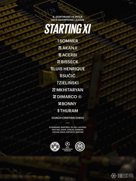 国际米兰首发:1-索默、31-比塞克、15-阿切尔比、25-阿坎吉、32-迪马尔科、22-姆希塔良、7-泽林斯基、8-苏契奇、11-路易斯-恩里克、9-马库斯-图拉姆、14-博尼